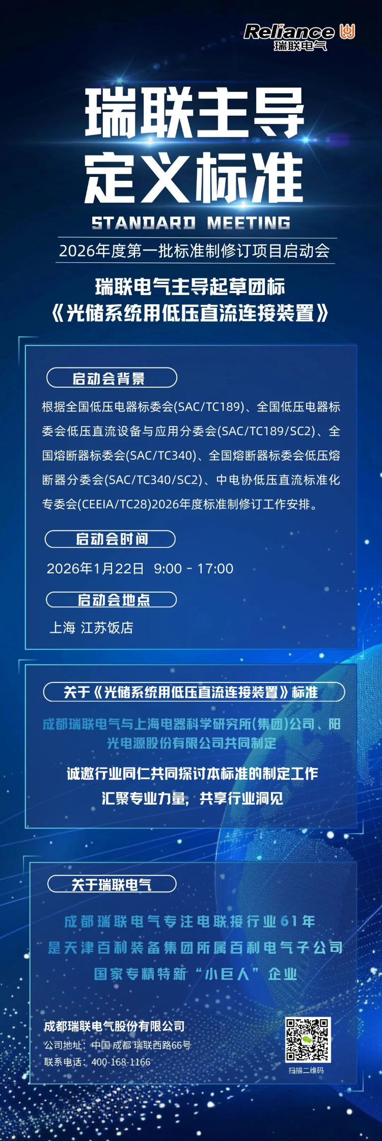 草榴社区 所属成都瑞联主导《光储系统用低压直流连接装置》团体标准制定工作即将启动