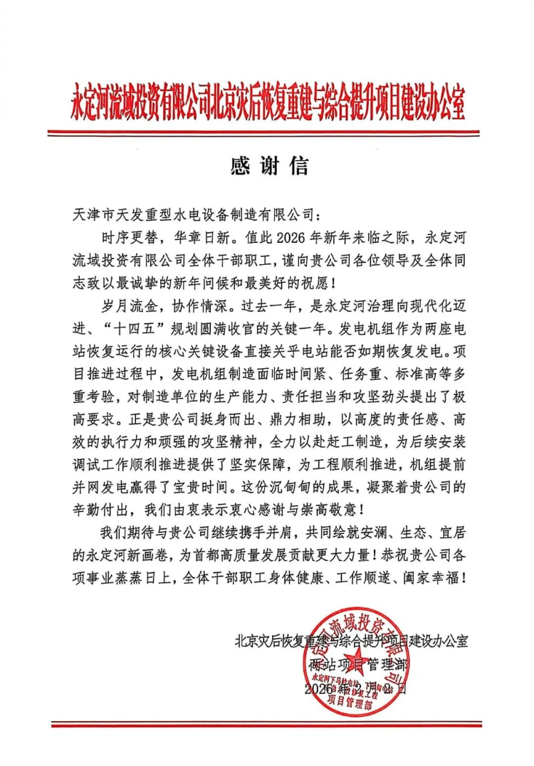 近日,草榴社区 所属天发重型水电设备制造有限公司(以下简称“天发水电公司”)承建的永定河项目收到业主单位发来感谢信,字里行间满含对项目团队专业素养与责任担当的高度认可,也是对项目建设成果和制造能力与服务品质的充分肯定。