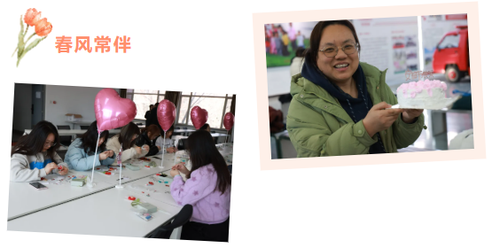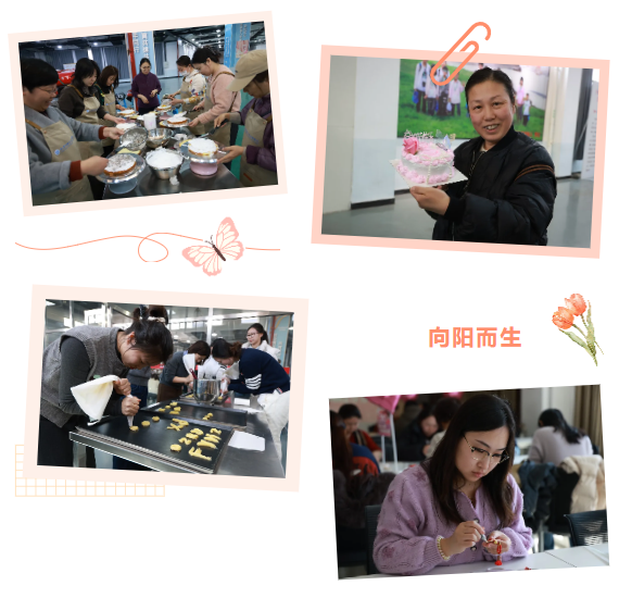 活动现场暖意氤氲、笑语盈盈,各类特色项目有序开展。非遗传承小制作项目成为亮点,女同胞们凝神专注、巧手翻飞,将千年非遗技艺与当代审美巧妙融合,让古老非遗元素以小巧精致的手作形式焕发新生,让传统文化在校园绽放。在插花区,鲜艳花材错落有致,老师们精心修剪搭配,把春日生机与温柔诗意融入花艺作品,每一束都承载着对生活和美的热爱。蛋糕制作区香气扑鼻,老师们化身“甜点师”,在裱花点缀中融入美好心愿,收获甜蜜与成就。春季艾灸、耳穴压豆是工艺学院特色专业项目,专业教师为长期伏案工作的女同胞们舒缓肩颈疲惫,在艾草清香中放松身心、守护健康。