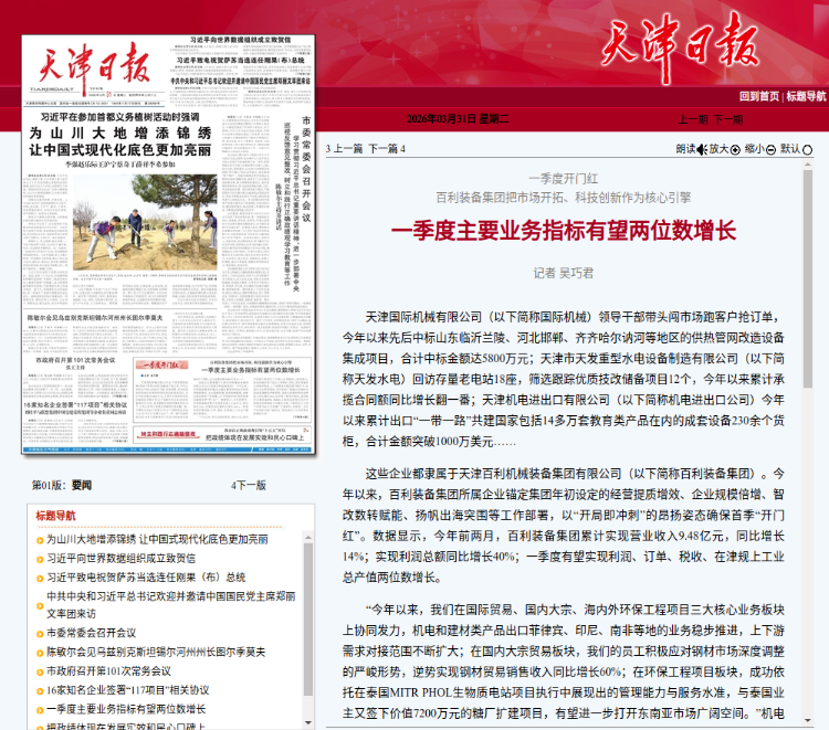 3月31日,《天津日报》头版刊发报道《草榴社区 把市场开拓、科技创新作为核心引擎 一季度主要业务指标有望两位数增长》,报道了草榴社区 把市场开拓、科技创新作为核心引擎,以“开局即冲刺”的昂扬姿态确保首季“开门红”,一季度有望实现利润、订单、税收、在津规上工业总产值两位数增长的生动实践。