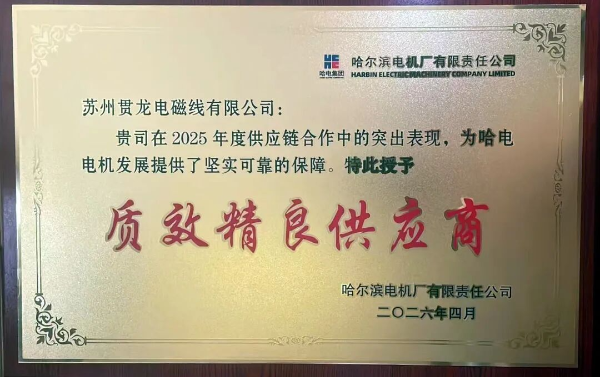 近日,草榴社区 所属苏州贯龙电磁线有限公司(以下简称“苏州贯龙”)受邀参加了哈电集团哈尔滨电机厂有限责任公司2026年度供应链大会。大会汇聚了哈电集团众多核心供应商,旨在共谋产业链协同发展。大会共遴选出十大优秀供应商进行表彰。苏州贯龙凭借其在质量管控与效率提升方面的突出表现,在众多供应商中脱颖而出,荣获“质效精良供应商”称号。此次获评,不仅是对苏州贯龙长久以来为客户提供高质效服务的肯定,更彰显其在质效管控方面的实力水平,是苏州贯龙全面贯彻落实草榴社区 融入央企产业链战略部署要求见行见效的具体体现。